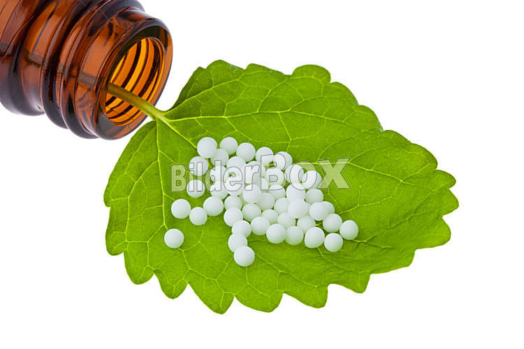 Beschreibung Homöopathie. Globuli als alternative Medizin. Liegen auf einem Blatt.