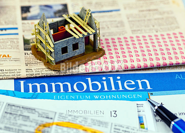 Beschreibung In einer Zeitung werden Immobilien zum Kauf angeboten. Inserate für Hauskauf und Wohnungssuche.
