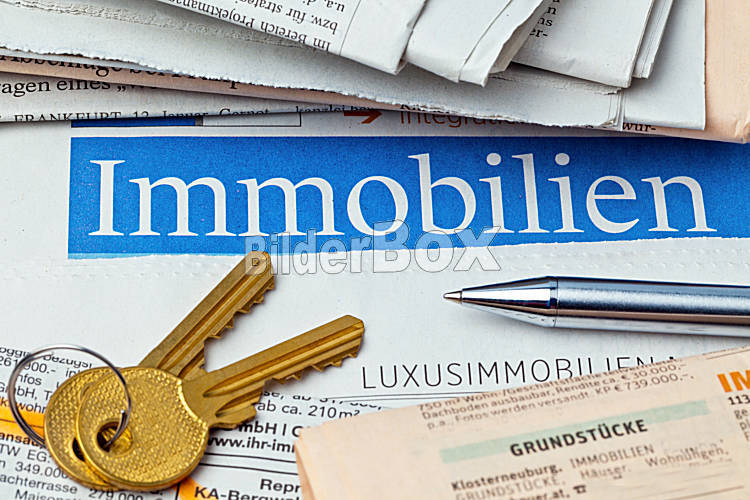 Beschreibung In einer Zeitung werden Immobilien zum Kauf angeboten. Inserate für Hauskauf und Wohnungssuche.
