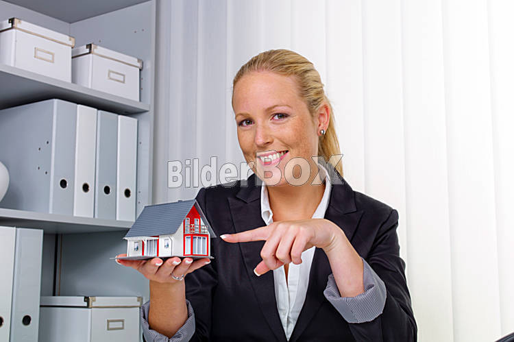 Beschreibung Eine junge Immobilien Maklerin mit einem Modellhaus in ihrem Büro.