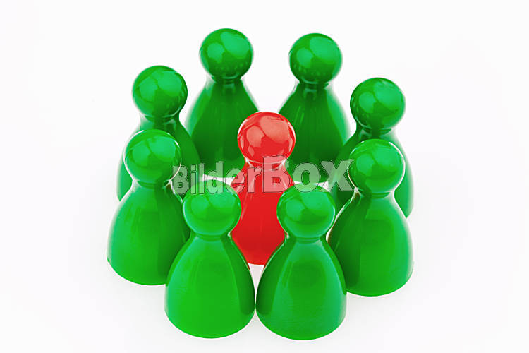 Beschreibung Rote und grüne Spielfiguren. Anders im Team. Frauenquote am Arbeitsplatz.