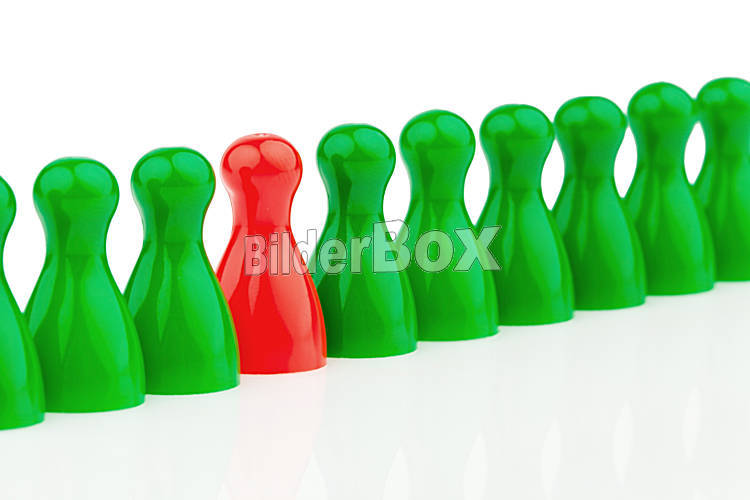 Beschreibung Rote und grüne Spielfiguren. Anders im Team. Frauenquote am Arbeitsplatz.