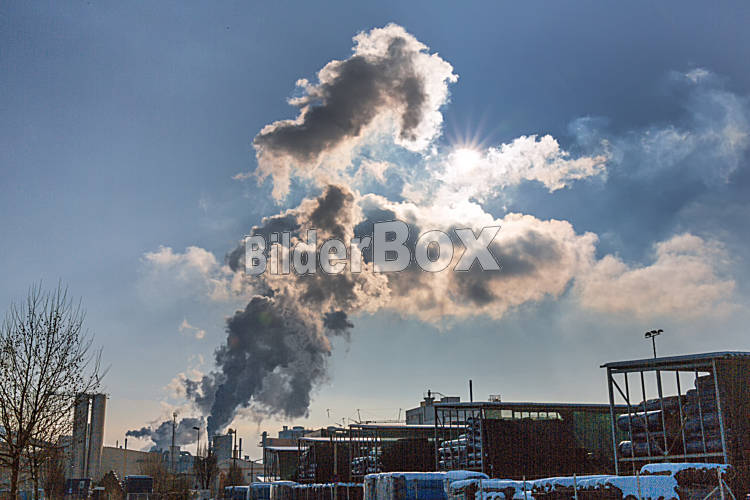 Beschreibung Schlot eines Industriebetriebes mit Rauch. Symbolfoto für Umweltschutz und Ozon.