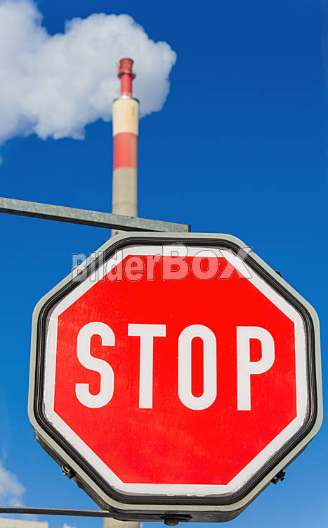 Beschreibung Schlot eines Industriebetriebes und Stopptafel. Symbolfoto für Umweltschutz und Ozon.