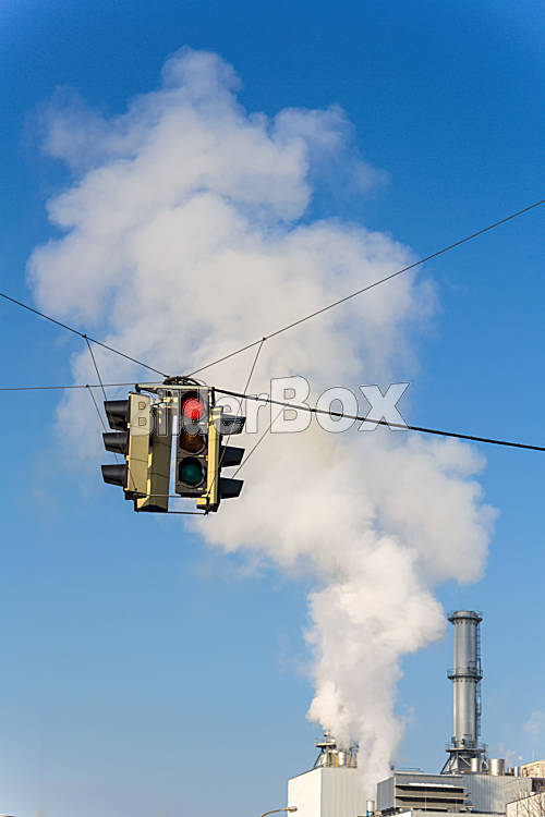 Beschreibung Schlot eines Industriebetriebes und roter Ampel. Symbolfoto für Umweltschutz und Ozon.