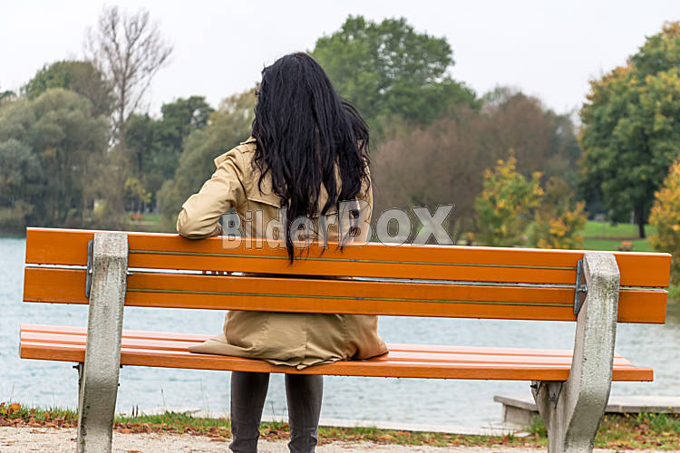Beschreibung Eine junge Frau sitzt nachdenklich auf einer Parkbank
