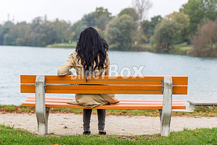 Beschreibung Eine junge Frau sitzt nachdenklich auf einer Parkbank