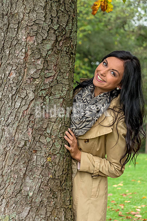 Beschreibung Eine junge Frau sieht hinter einem Baum hervor