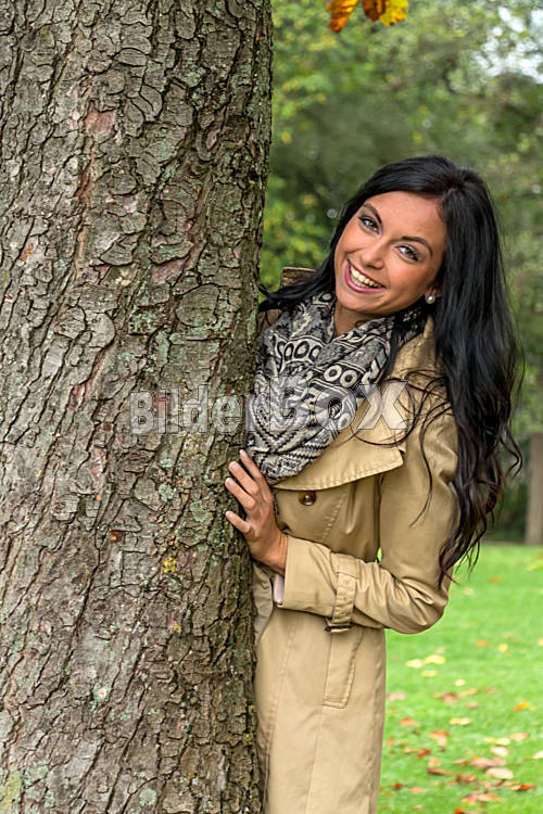 Beschreibung Eine junge Frau sieht hinter einem Baum hervor