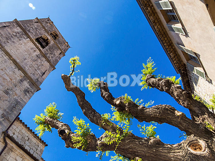 Beschreibung Junge Trieb an einem beschnittenen Baum. Vor blauem Himmel