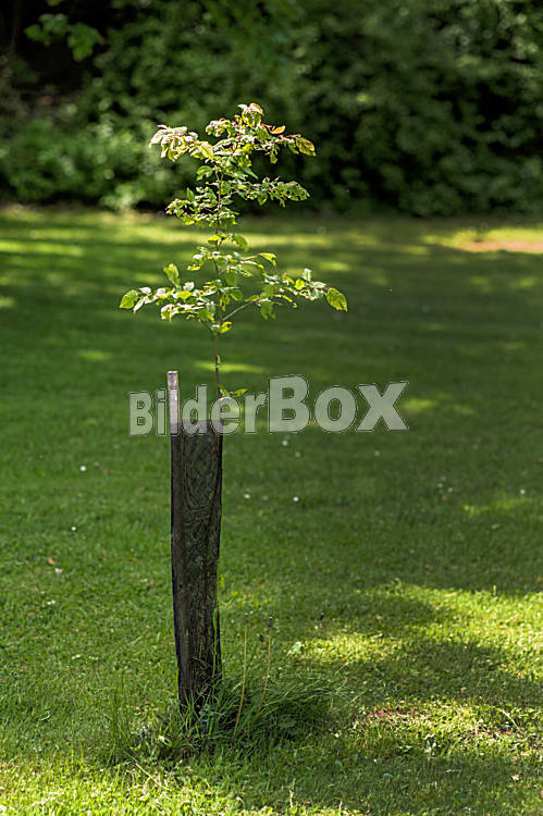 Junger Baum wurde gepflanzt. Aufforstung mit Schutz gegen Tiere