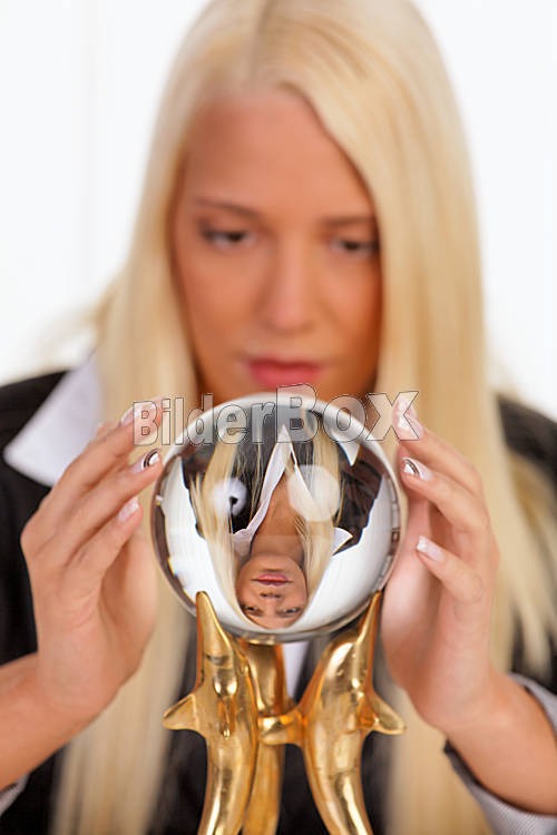 Beschreibung Junge Frau deutet die Zukunft aus einer Kristallkugel in ihren Händen