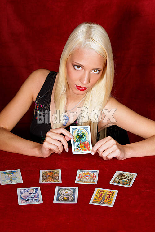Beschreibung Junge Frau deutet die Zukunft aus Tarotkarten in ihren Händen