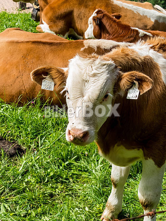 Beschreibung Kühe grasen auf der frischen Wiese einer Alm