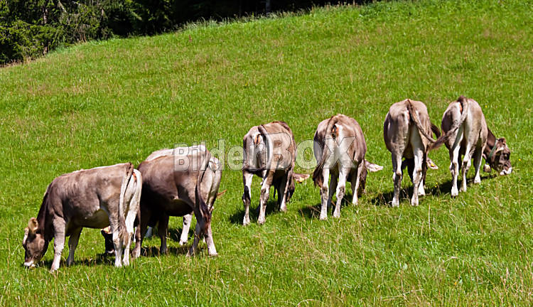 Beschreibung Mehrere Kühe weiden auf einer Alm und genießen den Sommer. Tiere in der Landwirtschaft