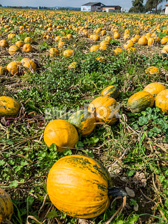 Beschreibung Ein großes Feld mit Kürbissen kurz vor der Ernte in Hörsching, Österreich.