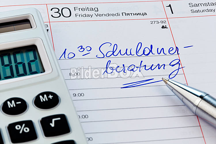 Beschreibung Kalender, Eintrag Schuldnerberatung, Symbolfoto für Privatinsolvenz und Armut
