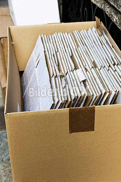 Beschreibung Kartons warten auf die Abholung durch die Müllabfuhr. Recycling von Altpapier.