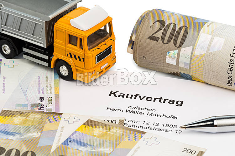 Beschreibung Der Kaufvertrag für einen neuen Lastwagen bei einem schweizer Autohändler. Mit Schweizer Franken.
