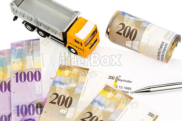 Beschreibung Der Kaufvertrag für einen neuen Lastwagen bei einem schweizer Autohändler. Mit Schweizer Franken.