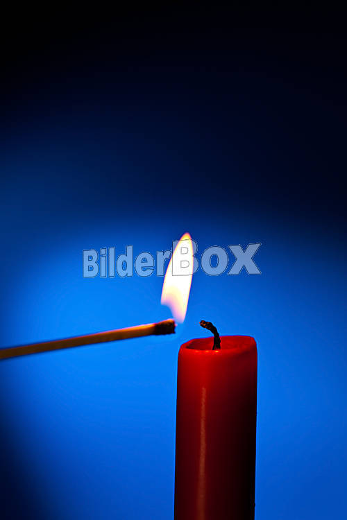 Beschreibung Eine rote Kerze wird mit einem Streichholz angezündet.