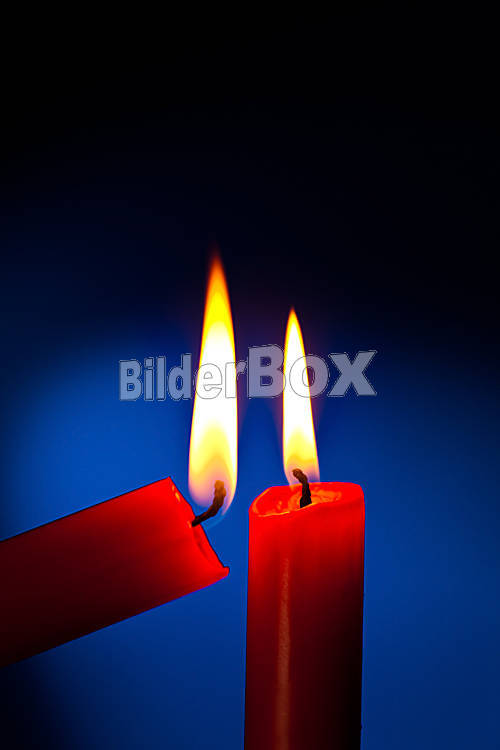 Beschreibung Eine rote Kerze wird mit einem Streichholz angezündet.