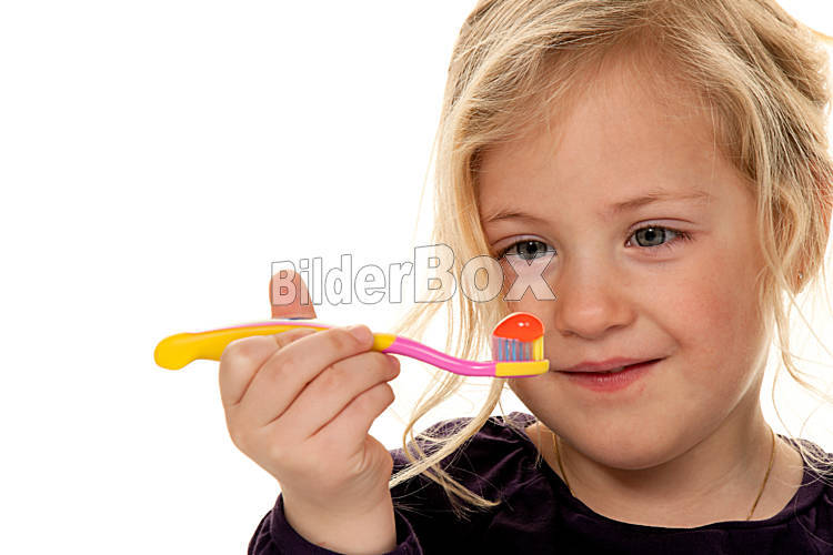 Kind beim Zähne putzen. Zahnbürste und Zahnpaste