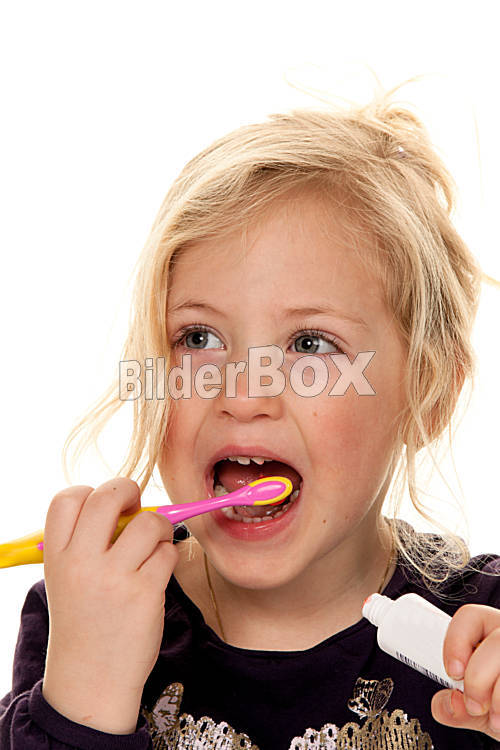 Kind beim Zähne putzen. Zahnbürste und Zahnpaste
