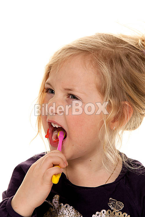 Kind beim Zähne putzen. Zahnbürste und Zahnpaste