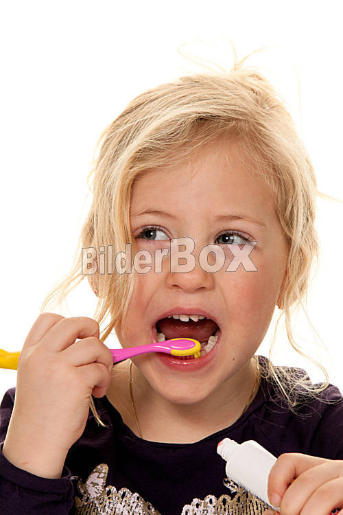 Kind beim Zähne putzen. Zahnbürste und Zahnpaste
