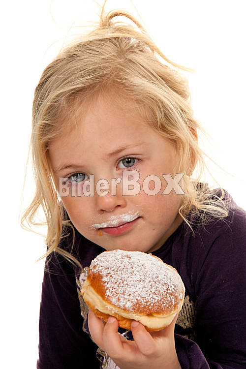Kind im Fasching mit Krapfen. Faschingskrapfen