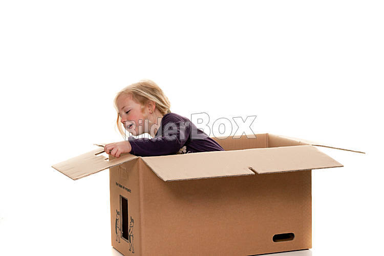 Kind in Umzugskarton. Liegt beim Umzug in Schachte