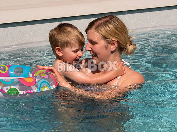 Beschreibung Ein Kind schwimmt mit einem Schwimmreifwn im Pool und kühlt sich an einem heißen Sommertag ab.