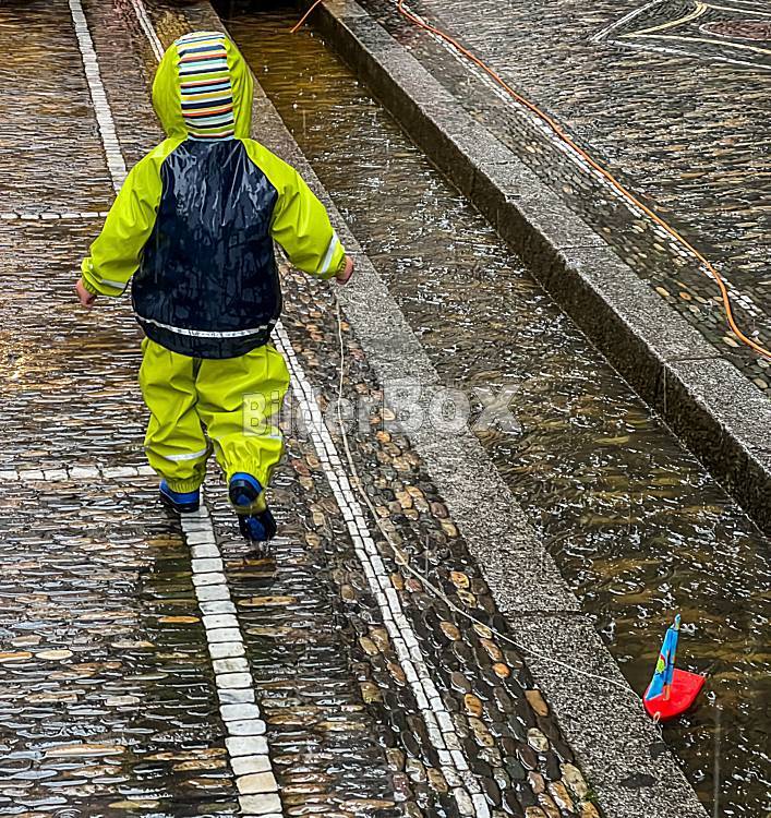 Kind spielt im Regenkind