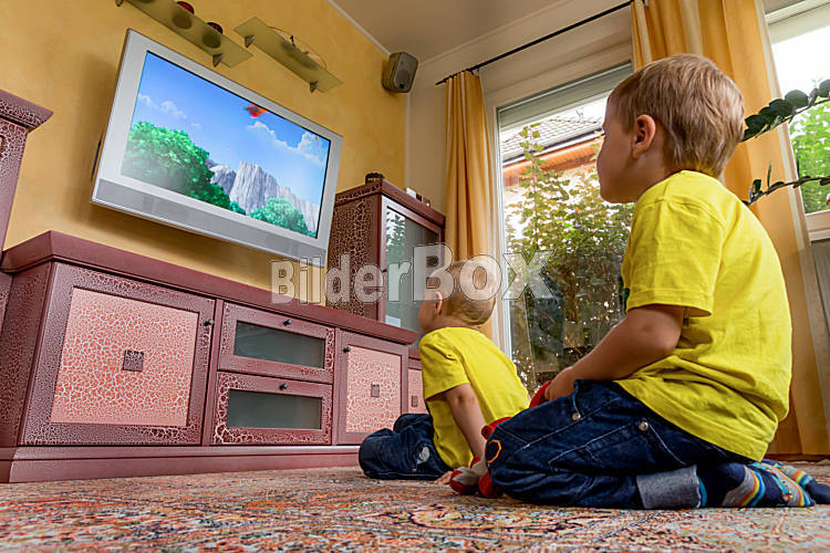 Beschreibung Kinder sitzen vor einem Fernsehgerät und sehen sich eine Kindersendung an.