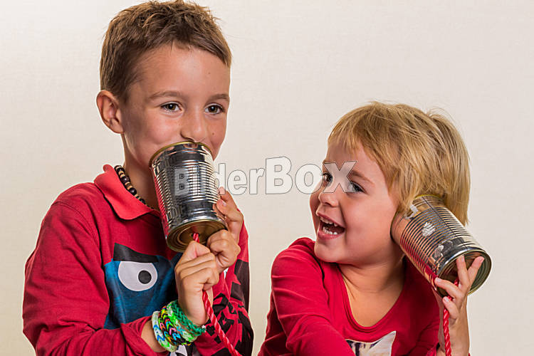 Beschreibung Zwei kleine Kinder telefonieren mit einem Telefon aus zwei Dosen.