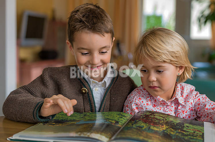 Beschreibung Zwei Kinder sehen sich zusammen ein Buch an