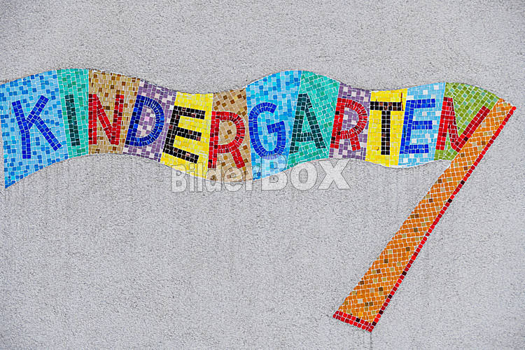 Beschreibung Kindergarten buntes Schild, Symbol für Kinderbetreuung und Kinderfreundlichkeit
