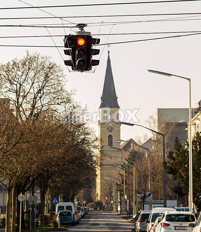 Kirche mit Ampel und Rotlicht