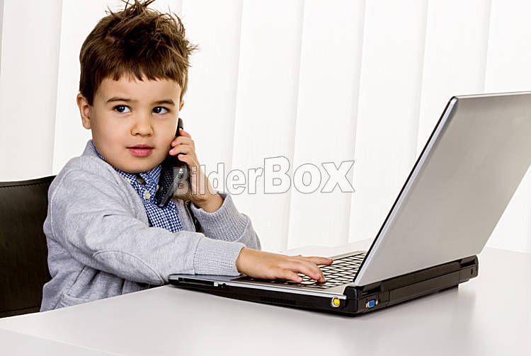 Beschreibung Kleiner Junge am Laptop, Symbol für Internet, E-Commerce, Konsumverhalten