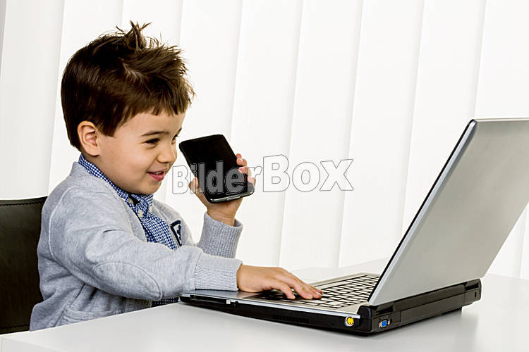 Beschreibung Kleiner Junge am Laptop, Symbol für Internet, E-Commerce, Konsumverhalten