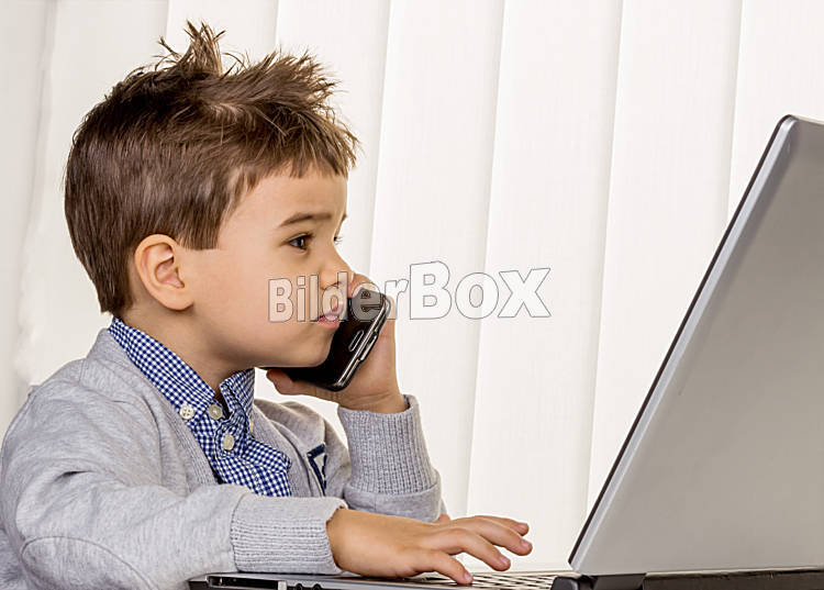 Beschreibung Kleiner Junge am Laptop, Symbol für Internet, E-Commerce, Konsumverhalten