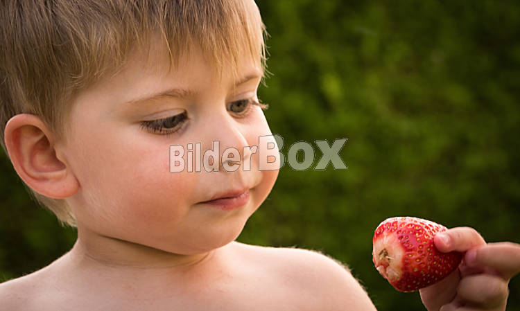 Beschreibung Ein kleiner Junge isst frische Erdbeeren aus dem eigenen Garten im Sommer