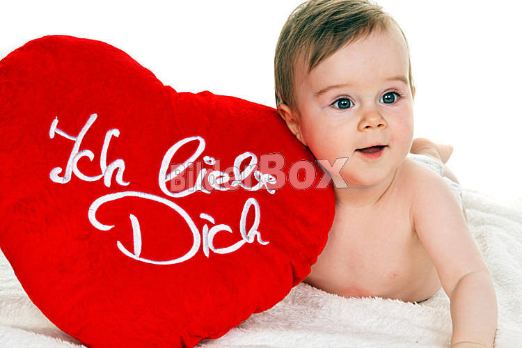 Beschreibung Kleines liegendes Kind Baby mit Polster Ich liebe Dich