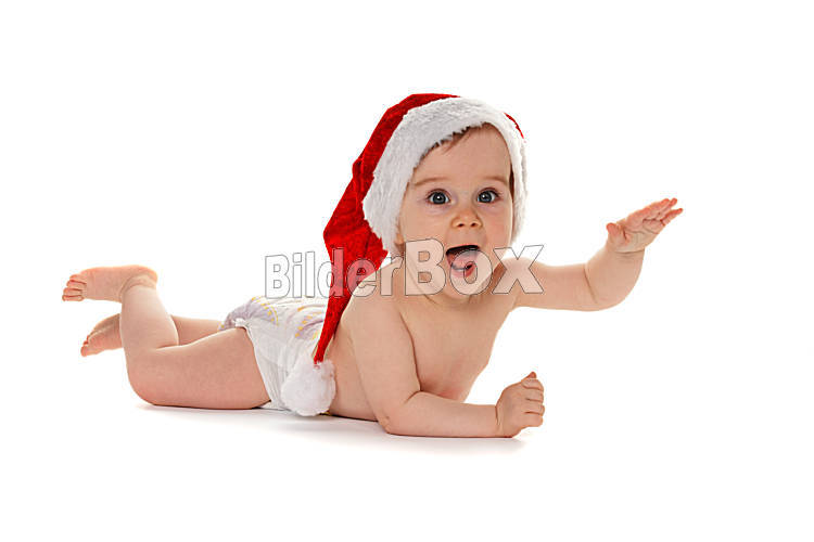 Beschreibung Kleines Kind baby mit Weihnachtsmann Mütze isoliert auf weißem Hintergrund