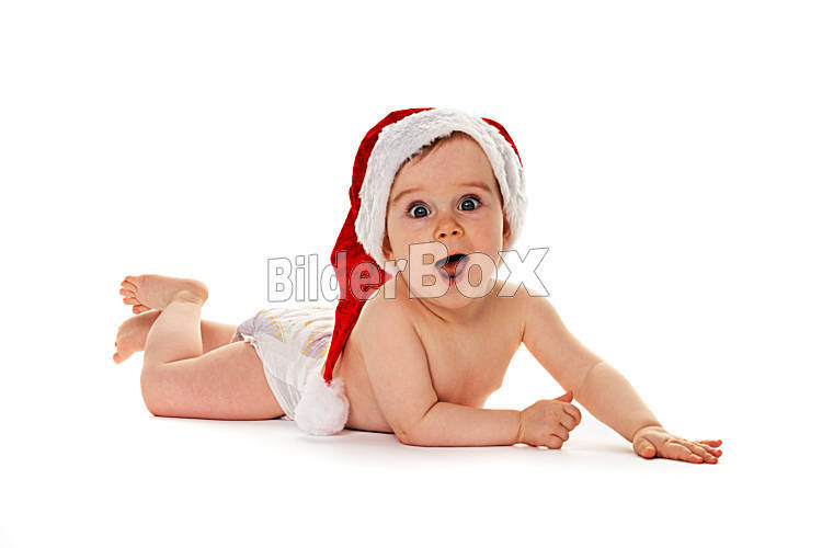 Beschreibung Kleines Kind baby mit Weihnachtsmann Mütze isoliert auf weißem Hintergrund