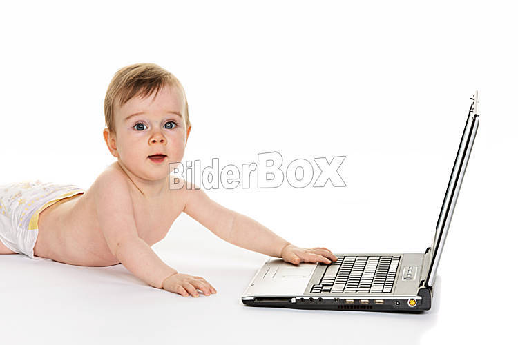 Beschreibung Kleines Kind in Windeln spielt mit einem Laptop Computer