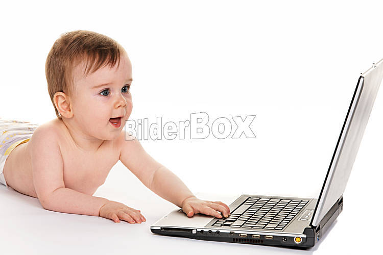 Beschreibung Kleines Kind in Windeln spielt mit einem Laptop Computer