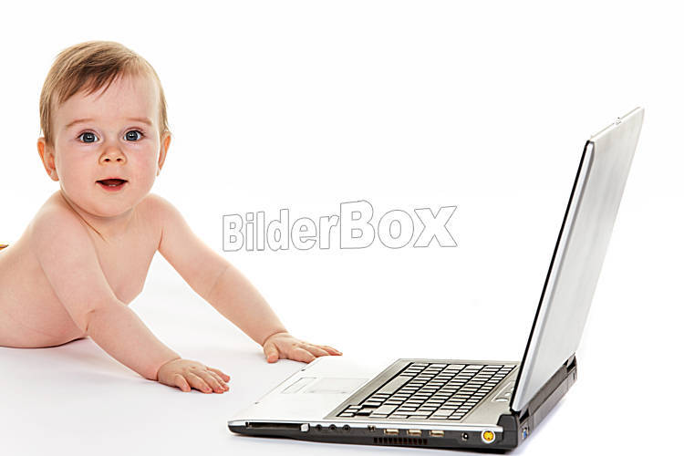 Beschreibung Kleines Kind in Windeln spielt mit einem Laptop Computer