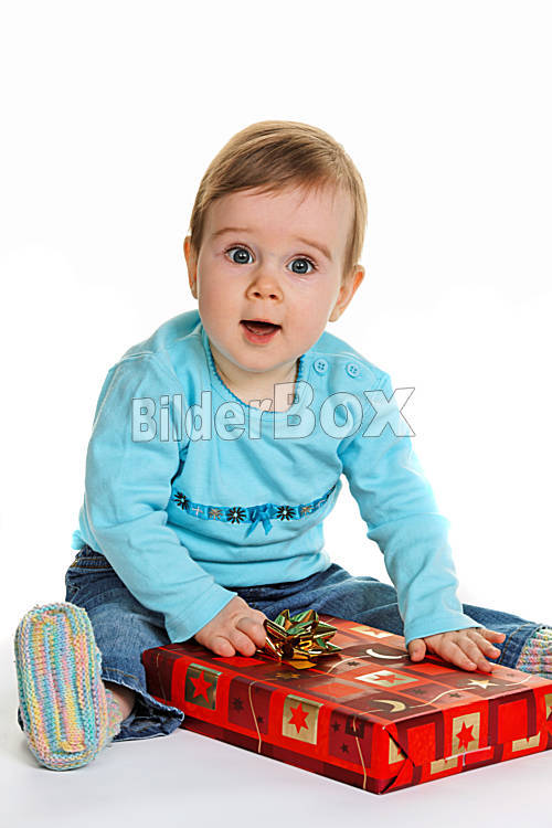 Beschreibung Kleines Kind Baby mit einem Geschenk Paket zu Weihnachten